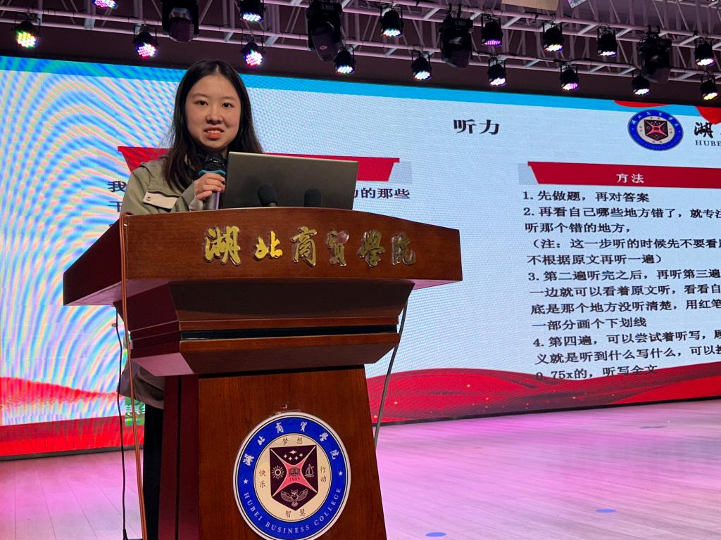 外国语学院罗欣悦以 “告别英语考试噩梦” 为题,结合自身学习英语的经验,为同学们提供了实用的学习方法和技巧。她说道,“英语学习并非一蹴而就,需要我们长期的积累和坚持。只要我们掌握了正确的学习方法,保持积极的学习态度,就能够告别英语考试的噩梦,取得优异的成绩。”