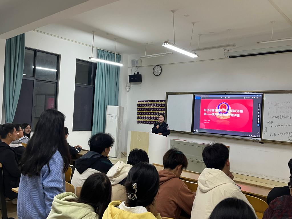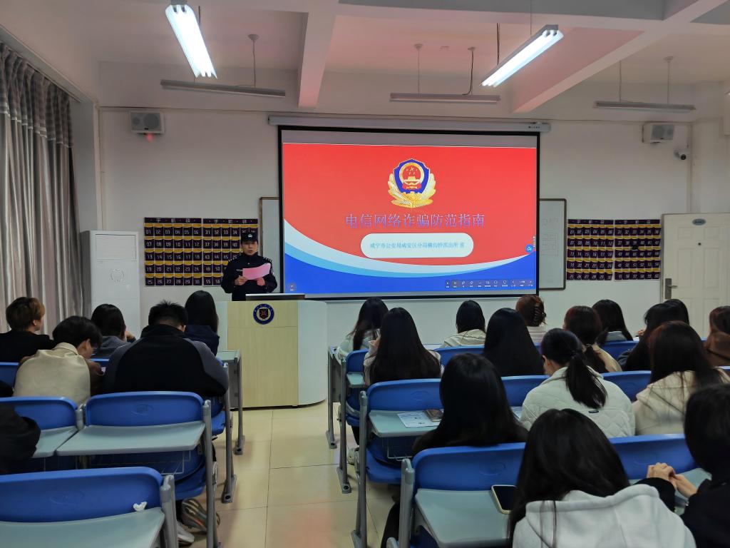 为切实筑牢校园反诈安全防线,有效预防和减少电信网络诈骗案件在学生群体中发生,提高同学们的自我防范意识和识骗防骗能力,10月26日晚,湖北商贸学院咸宁校区学工办联合保卫处精心组织,邀请辖区派出所民警走进班级,开展了一场“反诈宣讲进班会” 主题活动,为同学们带来了一堂生动实用的反诈安全课。