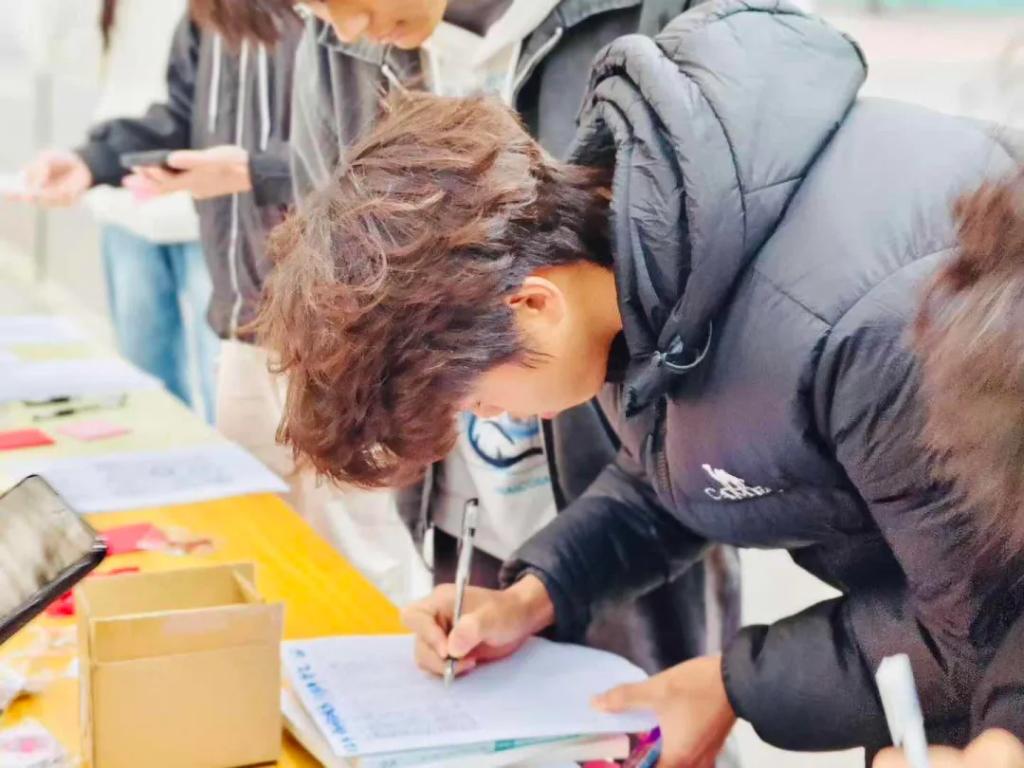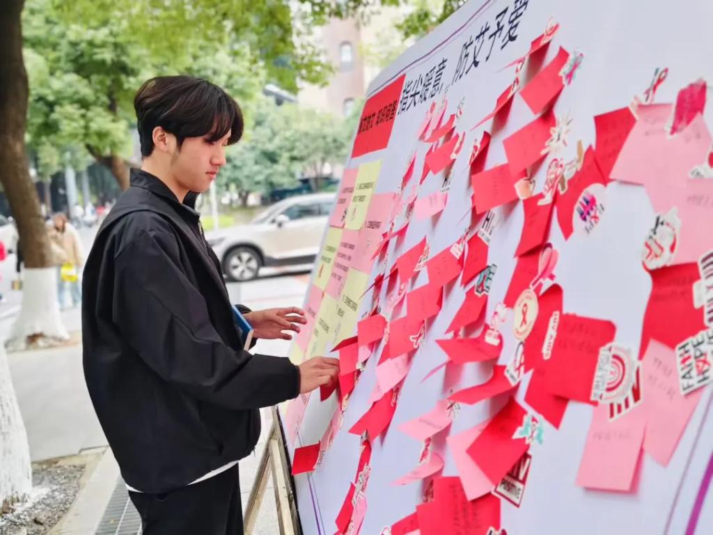 “以爱愈‘艾’,留言板上寄祝福”环节则以“社会共治 终结艾滋 共享健康”为主题,邀请同学们手写原创祝福语。大家将对艾滋病感染者的真诚关怀、对共抗艾滋的坚定决心、对青春健康的美好期许倾注于笔端,或写下暖心寄语,或郑重签下姓名。“愿每一份勇气都被温柔以待”“科学防艾,拒绝歧视,我们同行”……一句句真挚的话语汇聚成温暖的洪流,张贴在留言板上,不仅营造了全员参与防艾的浓厚氛围,更传递了消除歧视、尊重生命、人文关怀的核心信念,让同学们在情感共鸣中深化了对艾滋病感染者的理解与关爱。