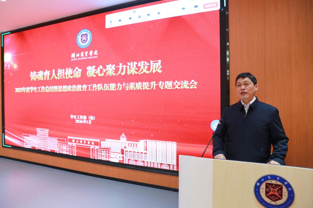 杨世雄作总结讲话,他代表学校党政向全体学工干部、辅导员以及协同育人各部门致以衷心感谢。他表示,过去一年学校学工系统面对新时代教育改革发展的新形势与青年学生成长成才的新要求,以高度的责任感和执行力,交出了一份有温度、有力度、有深度的育人答卷。展望新的一年,他提出四点希望:一是强化思想引领,锚定育人新定位。要紧紧围绕学校“十五五”规划发展蓝图,引导学生以“对标先进、见贤思齐”的明确方向,筑牢学生成长成才的思想根基;二是健全育人体系,构建育人新生态。要持续将“一站式”学生社区作为落实立德树人根本任务的重要平台,切实增强育人工作的精准性与实效性;三是筑牢安全底线,护航学生新安宁。要加强安全教育,不断提升学生安全防范与自我保护能力,营造安全稳定的校园育人氛围;四是提升综合素养,激活内生新动能。要深耕主责主业,持续加强理论学习,主动研究新时代学生成长规律,真正成为学生教育管理工作的行家把手。