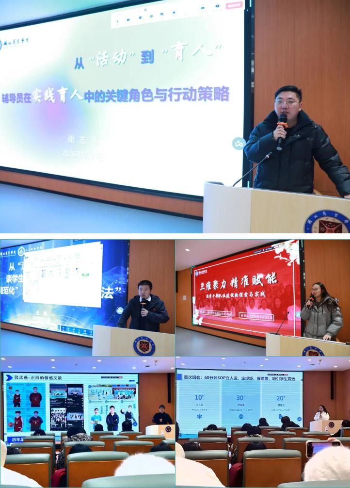 在育人实践工作经验交流环节中,艺术与传媒学院辅导员林偲彦以“班级管理的核心抓手:班干部队伍建设的实践路径”为题,聚焦班干部队伍建设的关键环节,系统拆解具体操作步骤,为一线辅导员优化班级管理效能提供了可复制的实践方案;经济与管理学院辅导员王开涛以“从‘面对面’到‘肩并肩’:与学生同实践中实现角色蜕变与能力提升”为题,结合个人工作实际,分享了与学生共同实践过程中的育人思考与成长体悟,为辅导员的职业角色转型与育人能力提升提供了生动的案例参考与经验借鉴;教育学院团委书记刘淞以“三维聚力·精准赋能:团学干部队伍建设的探索与实践”为题,系统梳理通过三维聚力模式培育团学干部的实践探索与成效,为团学干部队伍建设与赋能发展提供了创新思路与范式参考;人工智能学院党总支副书记王胜以“从‘流程化处置’模式谈学生突发事件处置中的‘规范化’‘时度效’与‘情理法’”为题,结合典型突发事件案例,就提升辅导员应急处置能力提供了系统的方法论指导;计算机科学与技术学院党总支书记谢志洋以“从‘活动’到‘育人’:辅导员在实践育人中的关键角色与行动策略”为题,深入剖析从活动开展至育人成效转化的内在逻辑,系统阐释了辅导员在实践育人中的核心职责与具体实施路径。