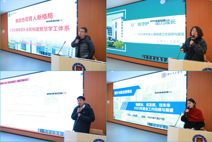 在相关职能部门与思想政治工作队伍总结交流环节,由学生工作部(处)处长毛宇主持。学生工作部(处)副处长王亮以“推动协同育人新格局:赋能辅导员队伍建设 构建智慧学工体系”为主题,从队伍建设、服务育人、智慧赋能等方面系统总结了2025年度学校学生工作;心理健康中心主任王祥君以““心”光守护 助力成长:2025年学生心理健康工作回顾与展望”为主题,全面回顾了2025年学生心理健康工作的成效与经验,并系统规划了下一阶段心理健康教育工作的重点任务与实施举措;招生与就业指导处副处长张怡丹以“稳就业、促发展、创未来:2025年就业工作回顾与展望”为主题,系统梳理与总结了2025年学校就业工作的推进成果与特色做法,围绕就业工作提质增效明确了后续的工作思路与攻坚方向;校团委书记成家睿以“促进学生全面发展:“第二课堂成绩单制度”实施与管理实践”为主题,详细解读了第二课堂成绩单制度的相关修订内容。