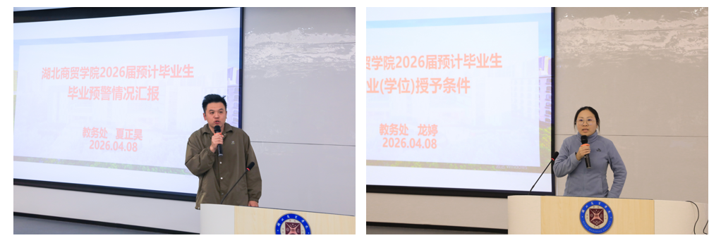 会上,教务处副处长龙婷对2026届毕业生毕业(学位)授予条件进行了解读,重点说明《湖北商贸学院学士学位授予工作细则(修订)》相关内容,要求各学院将最新学位授予规定全面传达至每一位学生,确保学士学位授予工作规范、有序推进。教务处夏正昊通报了2026届毕业生毕业预警情况,通过数据分析明确了当前毕业预警的主要成因,并结合预警学生的具体情况,提出了下一步针对性帮扶建议。