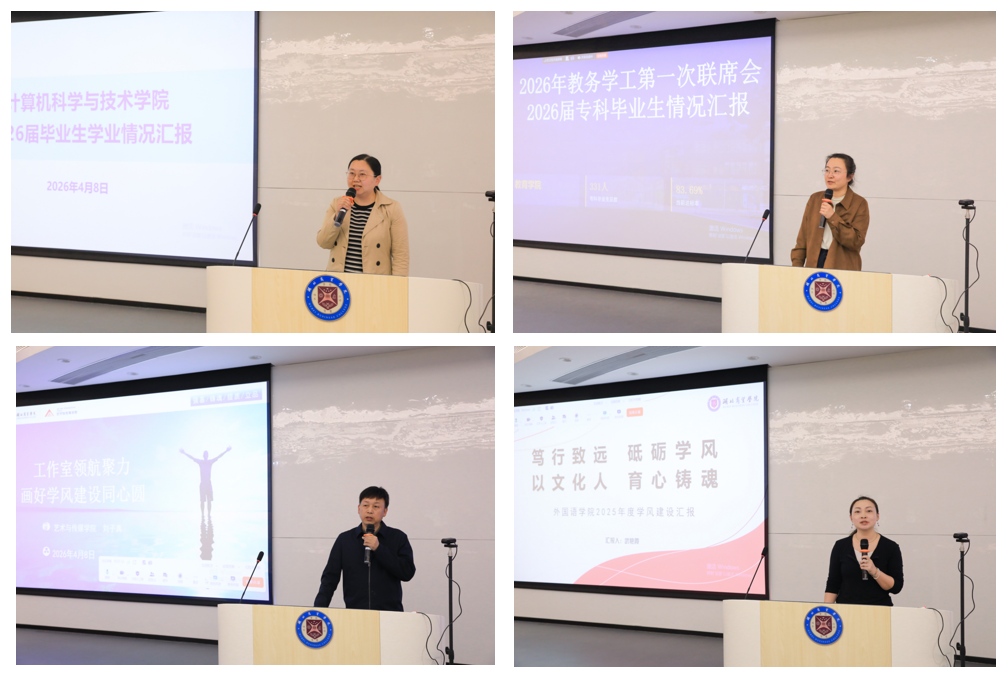 计算机科学与技术学院副院长詹翠丽围绕2026届毕业生工作,汇报了学业预警的基本概况与具体表现,明确下一步工作思路与落实举措。教育学院副院长于莹聚焦2026届毕业生工作,从全面统筹协调、分类精准施策、强化过程管控等方面,详细汇报后续改进方向。外国语学院党总支书记武艳霞围绕学风建设及2026届毕业生工作,从完善制度建设等方面,汇报工作落实情况与成效。艺术与传媒学院党总支书记刘子真聚焦学风建设及2026届毕业生工作,以优化过程管理等方面,汇报工作推进情况。